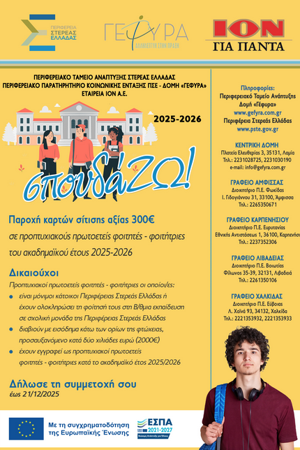 σε προπτυχιακούς πρωτοετείς φοιτητές – φοιτήτριες του ακαδημαϊκού έτους 2025-2026, μέλη οικογενειών της Περιφέρειας Στερεάς Ελλάδας,