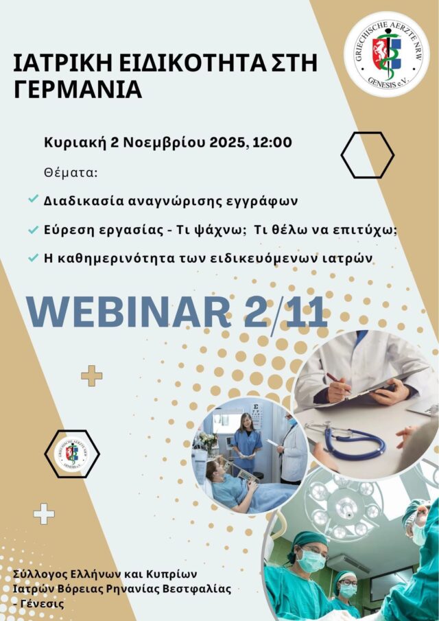 Ο Ιατρικός Σύλλογος Ελλήνων και Κυπρίων Ιατρών Βόρειας Ρηνανίας- Βεστφαλίας «ΓΕΝΕΣΙΣ» σας προσκαλεί στο διαδικτυακό σεμινάριο με θέμα «Ιατρική Ειδικότητα στη Γερμανία», την Κυριακή 2 Νοεμβρίου 2025 και ώρα 12:00 (ώρα Γερμανίας), μέσω της πλατφόρμας Zoom.